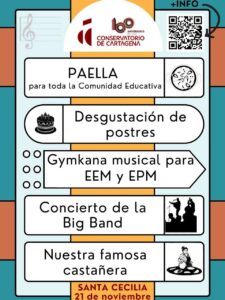 Este año celebramos la fiesta de Santa Cecilia con un montón de actividades pensadas para alumnos, profesores y personal del centro. Consulta las distintas opciones y disfruta de una jornada llena de música, juegos, ritmo y convivencia. 🎷🥁🎸
